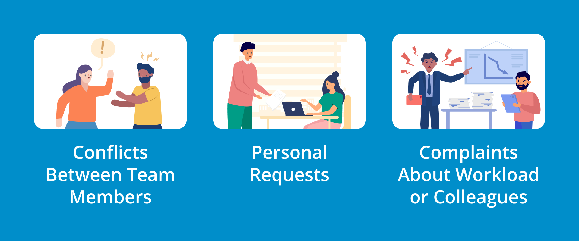 - Common workplace challenges include conflicts between team members, personal requests, and complaints about workload or colleagues.